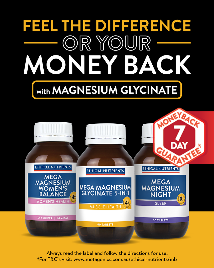 - The Offer allows Eligible Customers to try any ETHICAL NUTRIENTS Mega Magnesium Product (“Participating Products”) following the usage instruction on the bottle, and if they are not completely satisfied for any reason after 7-days from date of purchase, Eligible Customers have the opportunity to claim a money-back claim of their purchase price (up to AUD $99.95) (“money-back claim”). Customers who experience an adverse effect after taking Ethical Nutrients Mega Magnesium Product should cease use immediately and seek advice from a health professional. In the event of a health emergency, call 000 (Australia).