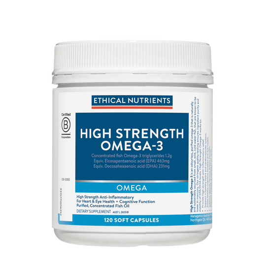 High Strength Omega-3 is a supplement for mild arthritis, cardiovascular health and cognitive function, helping provide anti-inflammatory relief, support a healthy heart, and maintain healthy blood lipids, eye health and nervous system function.