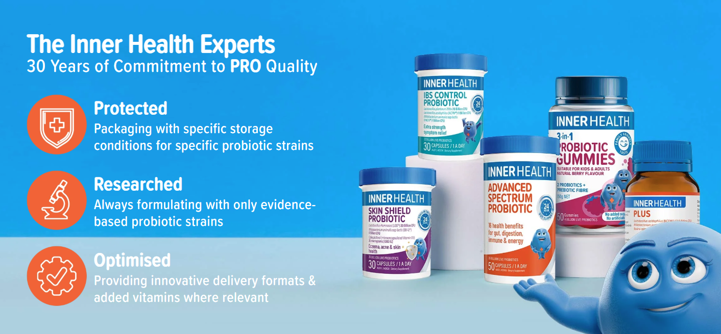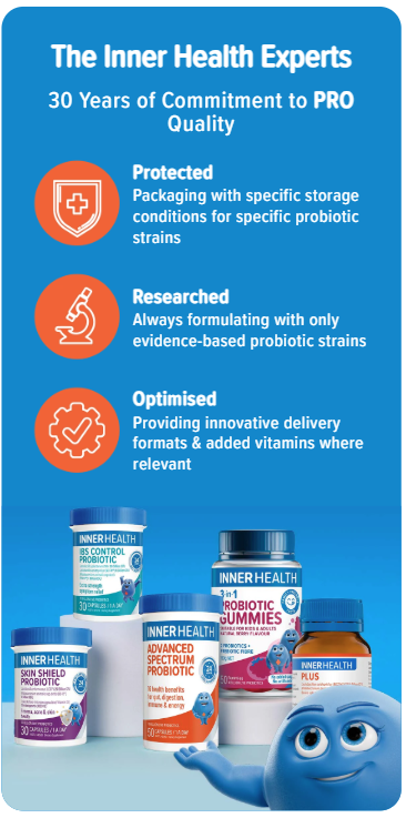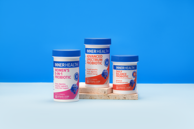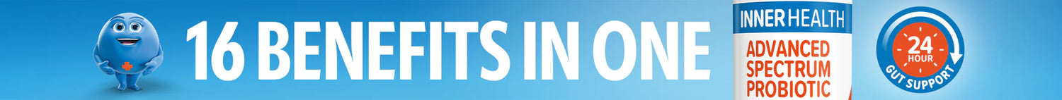 Formulated with a unique blend of probiotic strains and nutrients, Advanced Spectrum Probiotic is Inner Health's most diverse probiotic. With 16 benefits in one daily capsule, it supports energy levels, immunity, skin health and maintains levels of vitamin D, B1 & B2.