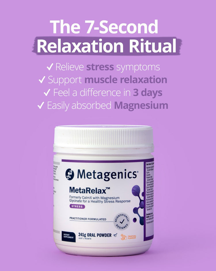 MetaRelax™ is great tasting and helps to relieve the symptoms of stress, supports a heathy stress response and neuroendocrine function. It contains Meta Mag® - Magnesium bisglycinate, an exclusive form of magnesium with enhanced bioavailability as well as taurine, potassium citrate, vitamin B6 and vitamin C.