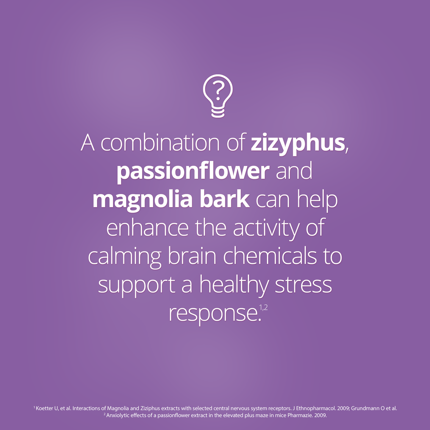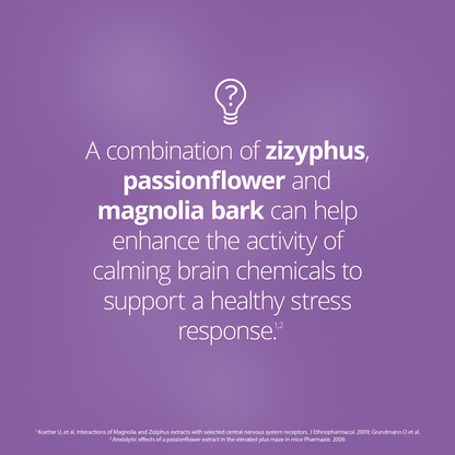 When the body perceives stress in it's environment, it activates signals within the brain, which go on to activate the release of stress hormones. Zizphypus, magnolia and passionflower help to balance these initial signals, before the body activates the release of stress hormones.1-3