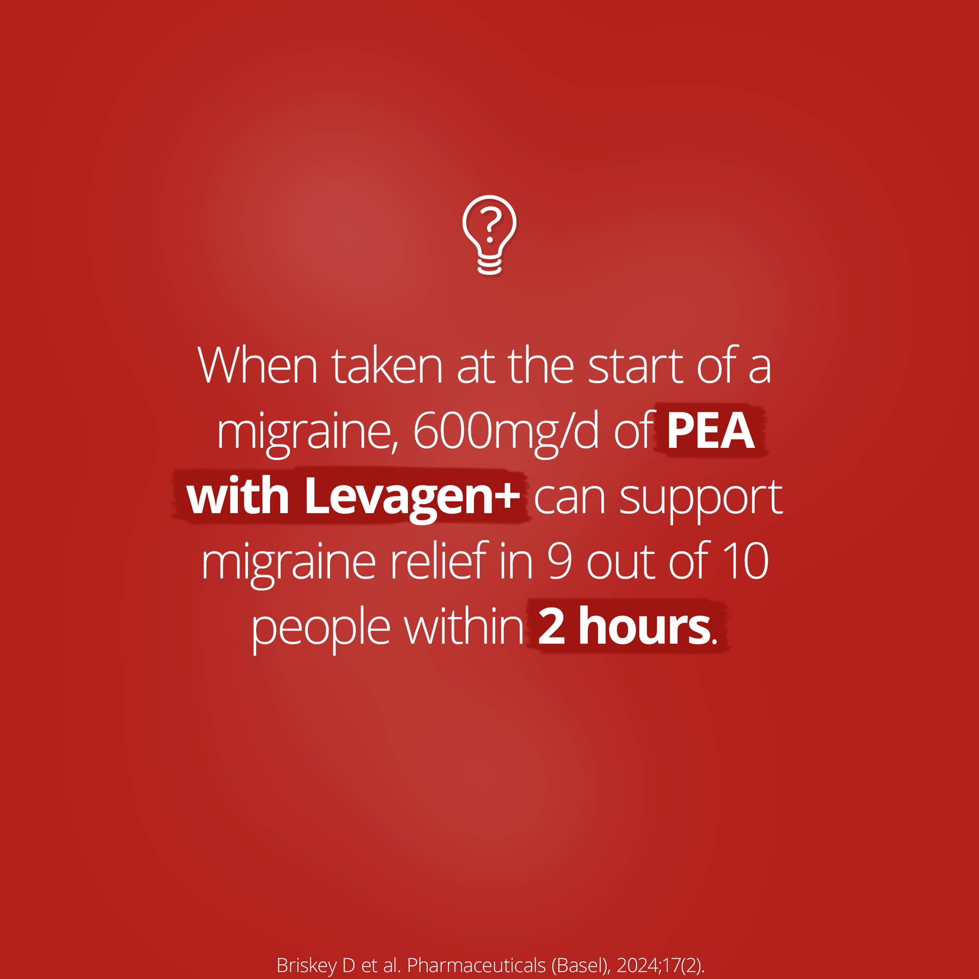 Levagen+ PEA™ is a specialised, clinically trialled and scientifically verified form of PEA that is highly absorbable for rapid nerve pain and inflammation relief. Levagen+™ is a patented form of PEA that uses LipiSperse® technology to improve absorption by 1.7 times.[1] It’s shown to reduce headache pain by up to 85%, similar to ibuprofen. [2]