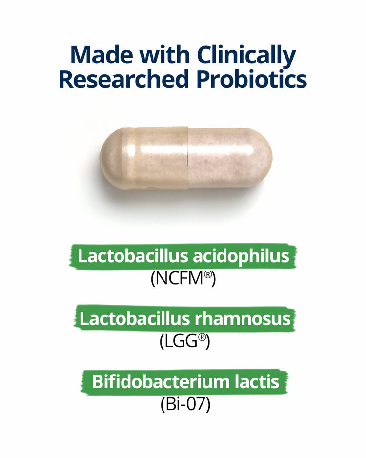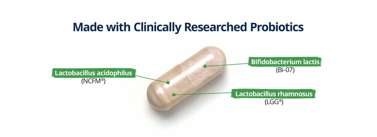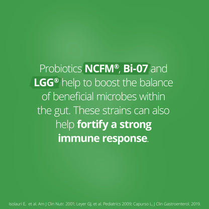 NCFM® helps reduce bloating and gut pain, and supports immune health.¹,⁴,⁵ Bi-07 support gut health and helps fight off infections.¹⁻⁵ LGG® is one of the most studied probiotics and supports both gut health and immunity.⁶