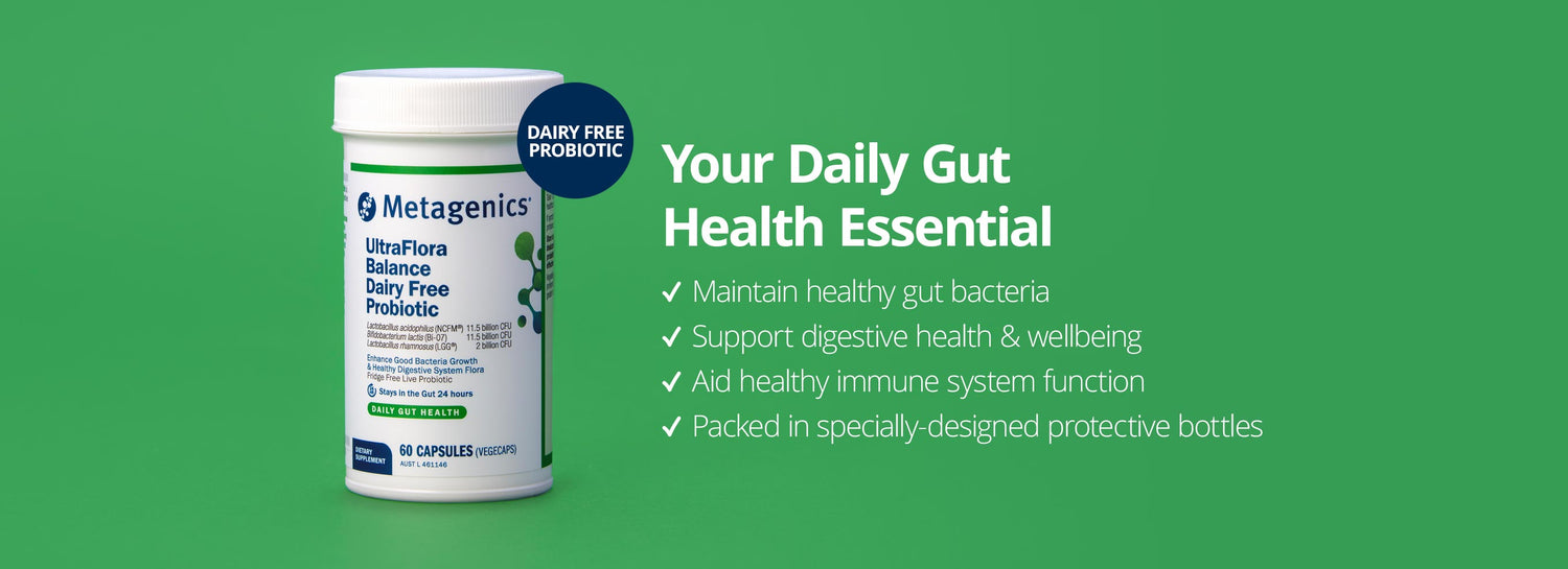 UltraFlora Balance Dairy Free Probiotic supports gut function. It contains specific probiotic strains that reduce digestive discomfort such as bloating and pain¹,² aswell as promote a healthy immune response.³⁻⁶ UltraFlora Balance Dairy Free Probiotic can help to nurture your gut microbiome to help your body digest food better, fight off illness, and feel more balanced overall.