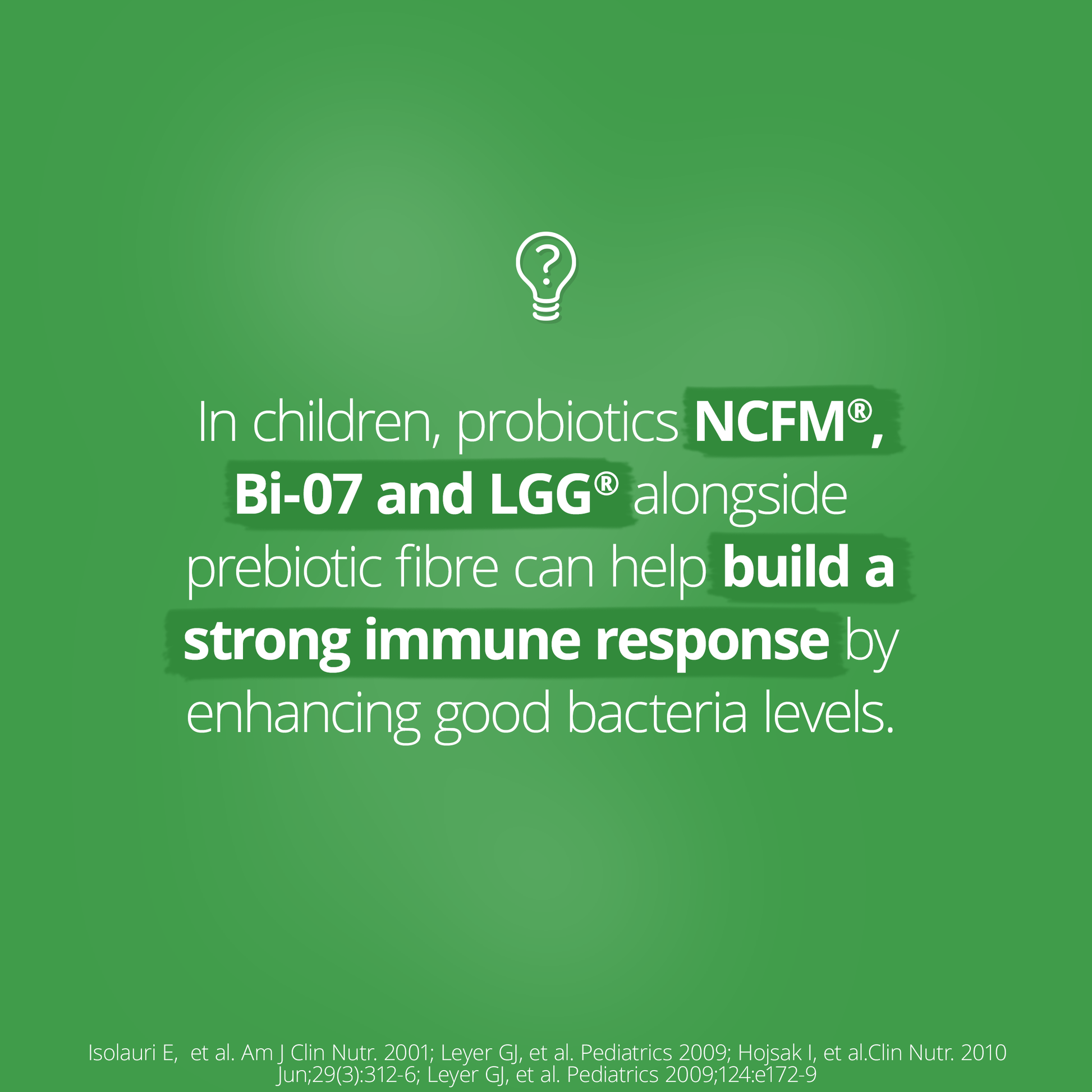 UltraFlora Kids Care is expertly designed to maintain healthy bowel function and support a healthy immune system in children. This specialised probiotic blend features three scientifically formulated strains: Lactobacillus rhamnosus (LGG®), Lactobacillus acidophilus (NCFM®), and Bifidobacterium lactis (Bi-07), all working together to help restore healthy gut flora levels.