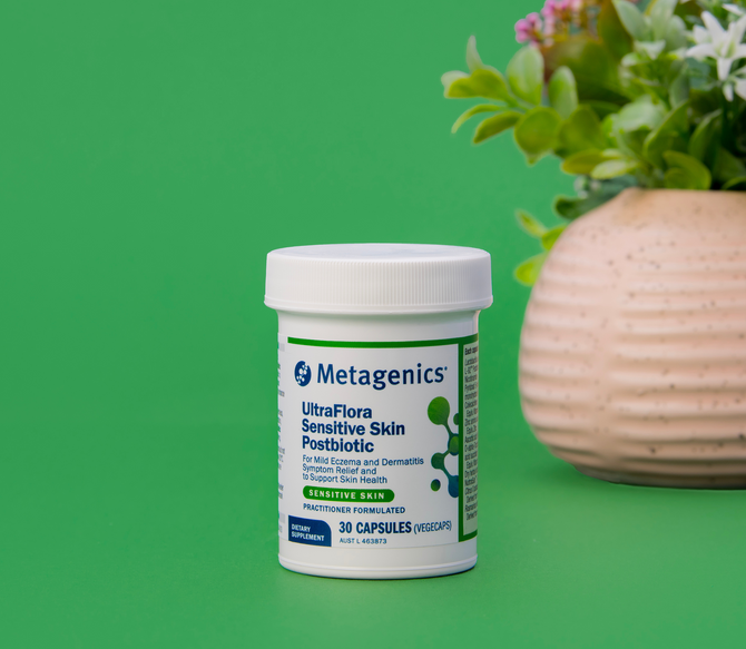 Nourishing Skin Health and Repair, UltraFlora Sensitive Skin Postbiotic contains a blend of L-92™ Postbiotic to relieve symptoms of mild eczema and dermatitis, and NutroxSun™ to help enhance skin elasticity.