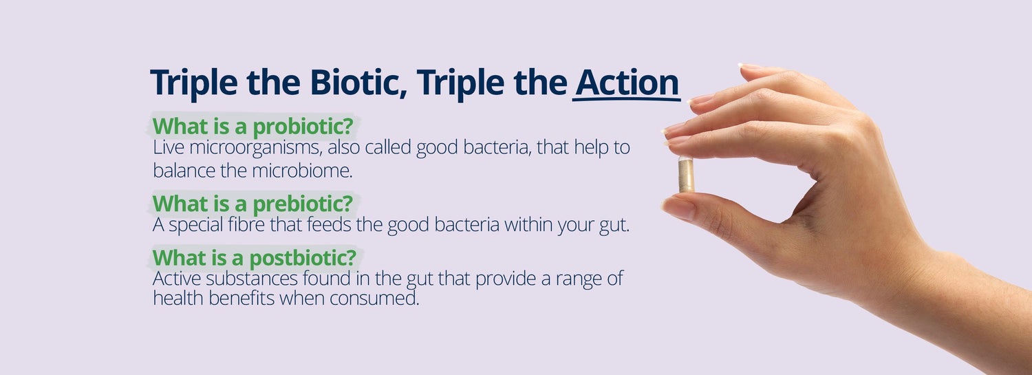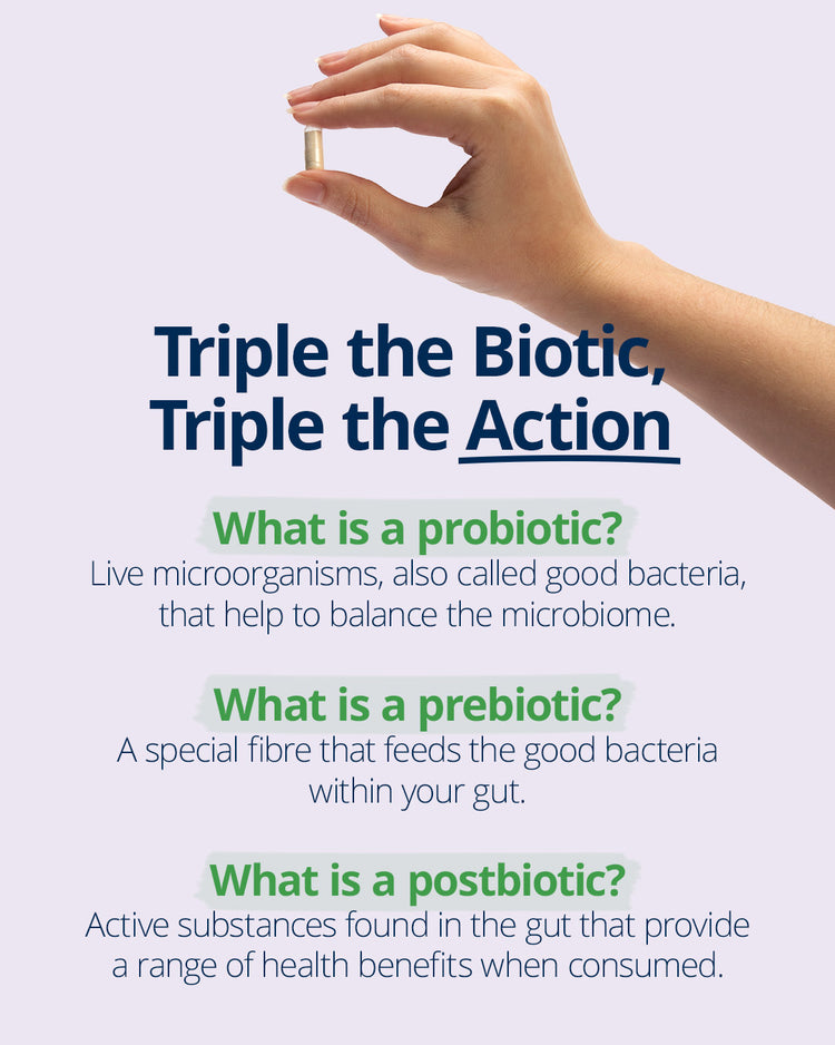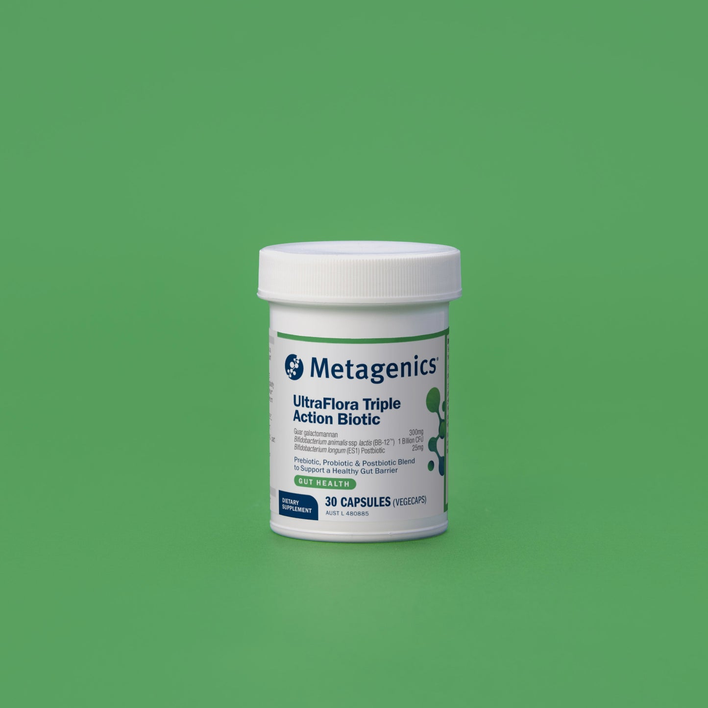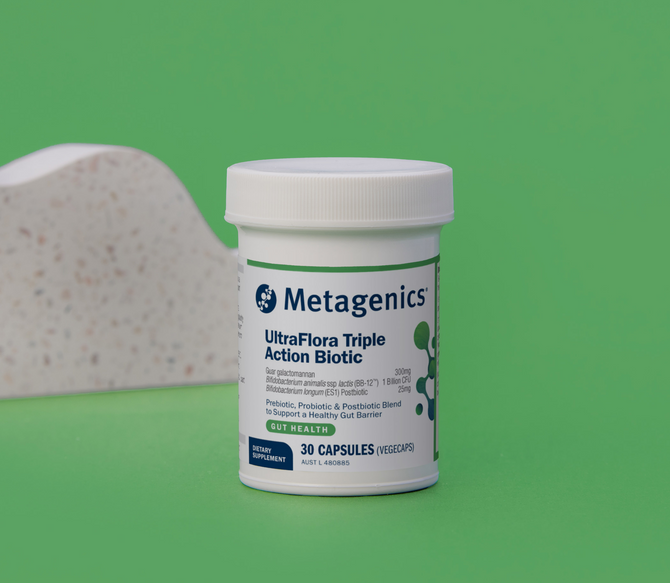 UltraFlora Triple Action Biotic contains a prebiotic, probiotic and postbiotic to support gut barrier and lining health. UltraFlora Triple Action Biotic supports digestive comfort, bloating and bowel regularity with clinically trialed doses of Bifidobacterium longum (ES-1) Postbiotic and Bifidobacterium animalis spp lactis (BB-12™).
